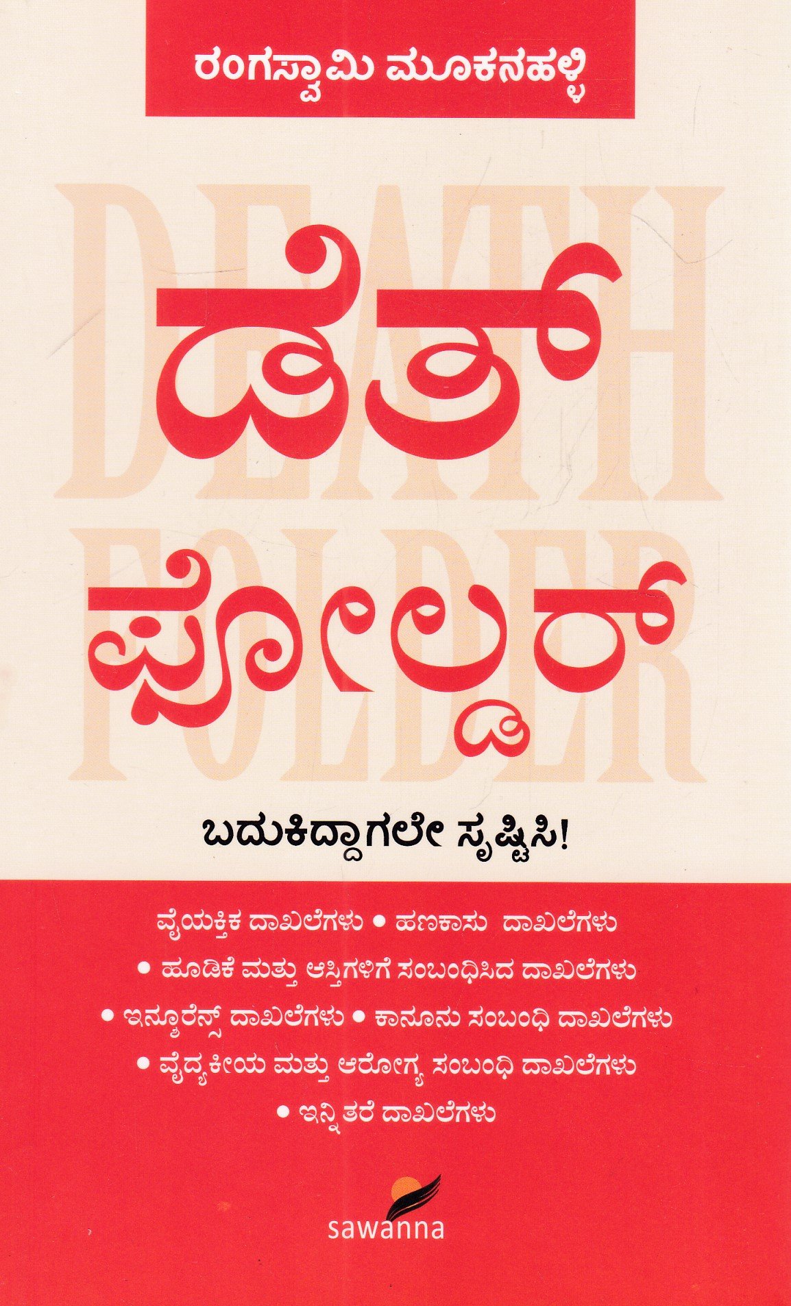 ಡೆತ್ ಫೋಲ್ಡರ್ / Death Folder – ಎಂಬುದು ಖ್ಯಾತ ಹಣಕಾಸು ತಜ್ಞ ಮತ್ತು ಲೇಖಕ ರಂಗಸ್ವಾಮಿ ಮೂಕನಹಳ್ಳಿ (Rangaswamy Mookanahalli) ಅವರು ಬರೆದಿರುವ ಅತ್ಯಂತ ಪ್ರಾಯೋಗಿಕ ಮತ್ತು ಅವಶ್ಯಕ ಪುಸ್ತಕವಾಗಿದೆ. ಈ ಪುಸ್ತಕವು ವ್ಯಕ್ತಿಯ ಮರಣದ ನಂತರ ಅವರ ಕುಟುಂಬದ ಸದಸ್ಯರು ಎದುರಿಸಬಹುದಾದ ಆರ್ಥಿಕ ಮತ್ತು ಕಾನೂನು ಸಮಸ್ಯೆಗಳನ್ನು ನಿವಾರಿಸಲು “ಡೆತ್ ಫೋಲ್ಡರ್” ಅಥವಾ ದಾಖಲೆಗಳ ಸಂಗ್ರಹವನ್ನು ಹೇಗೆ ಸಿದ್ಧಪಡಿಸಬೇಕು ಎಂಬುದರ ಬಗ್ಗೆ ಸಂಪೂರ್ಣ ಮಾರ್ಗದರ್ಶನ ನೀಡುತ್ತದೆ.